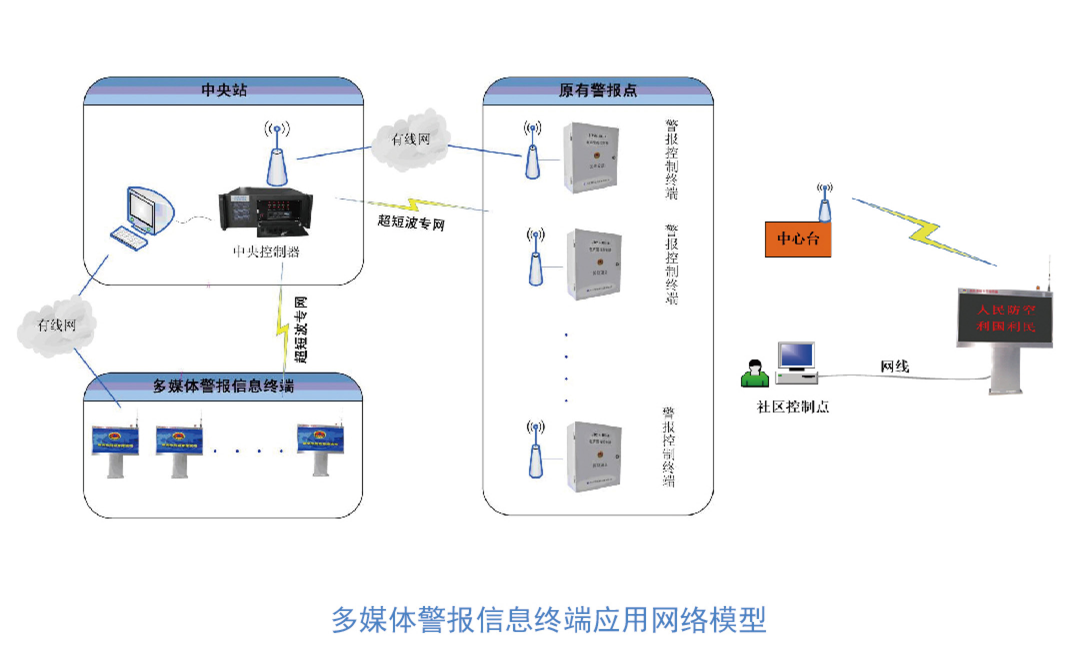 - 多媒體警報信息終端融入警報統(tǒng)控網(wǎng),和既有 警報點(diǎn)均接受中心臺統(tǒng)控。